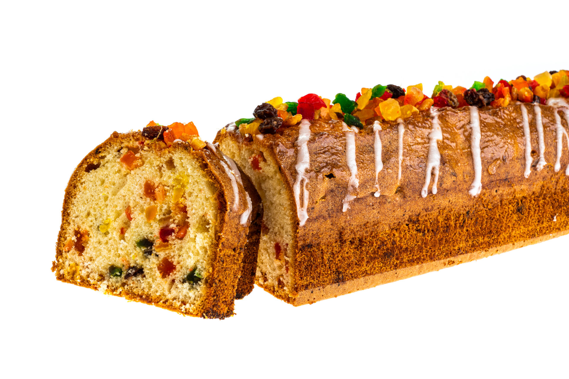 Ciasto biszkoptowo-tłuszczowe z owocami kandyzowanymi, polane lukrem.
